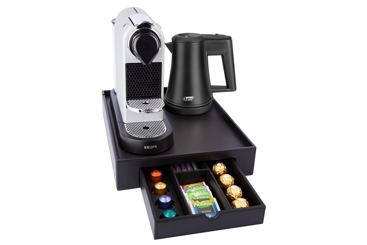 A series of hotel welcome sets with an electric kettle, space for cups and a capsule coffee machine.