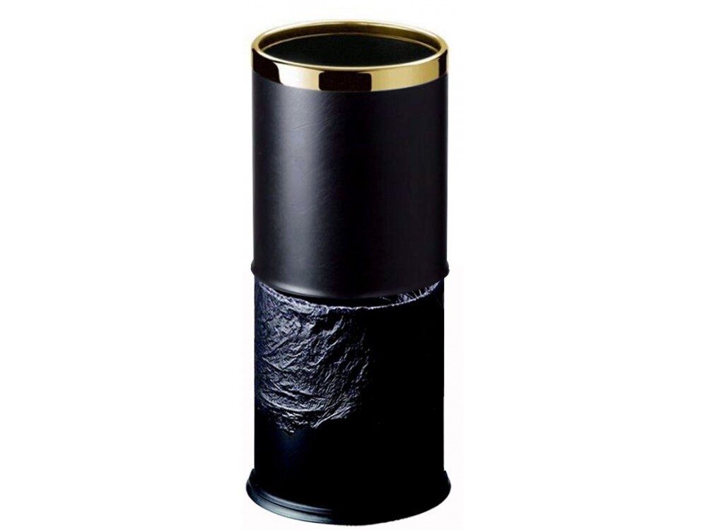 Kosz hotelowy z ekoskóry z ozdobną złotą obręczą.