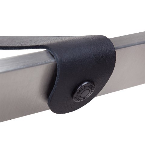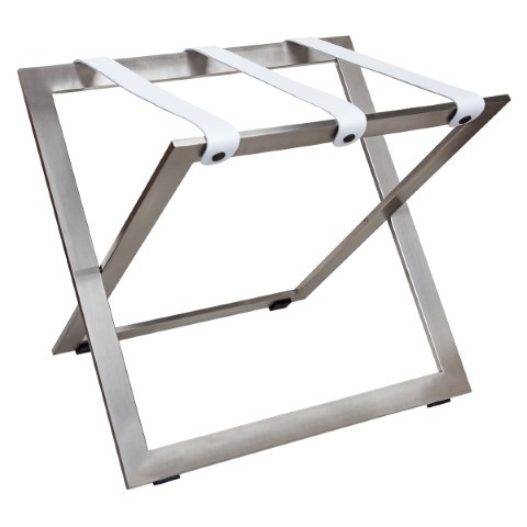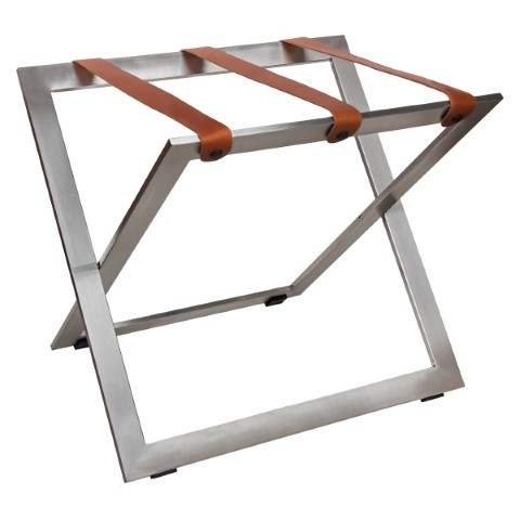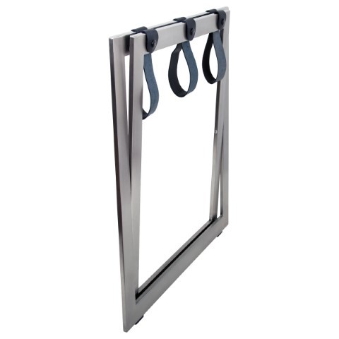 Stojak na bagaż ze stali nierdzewnej ze skórzanymi pasami.